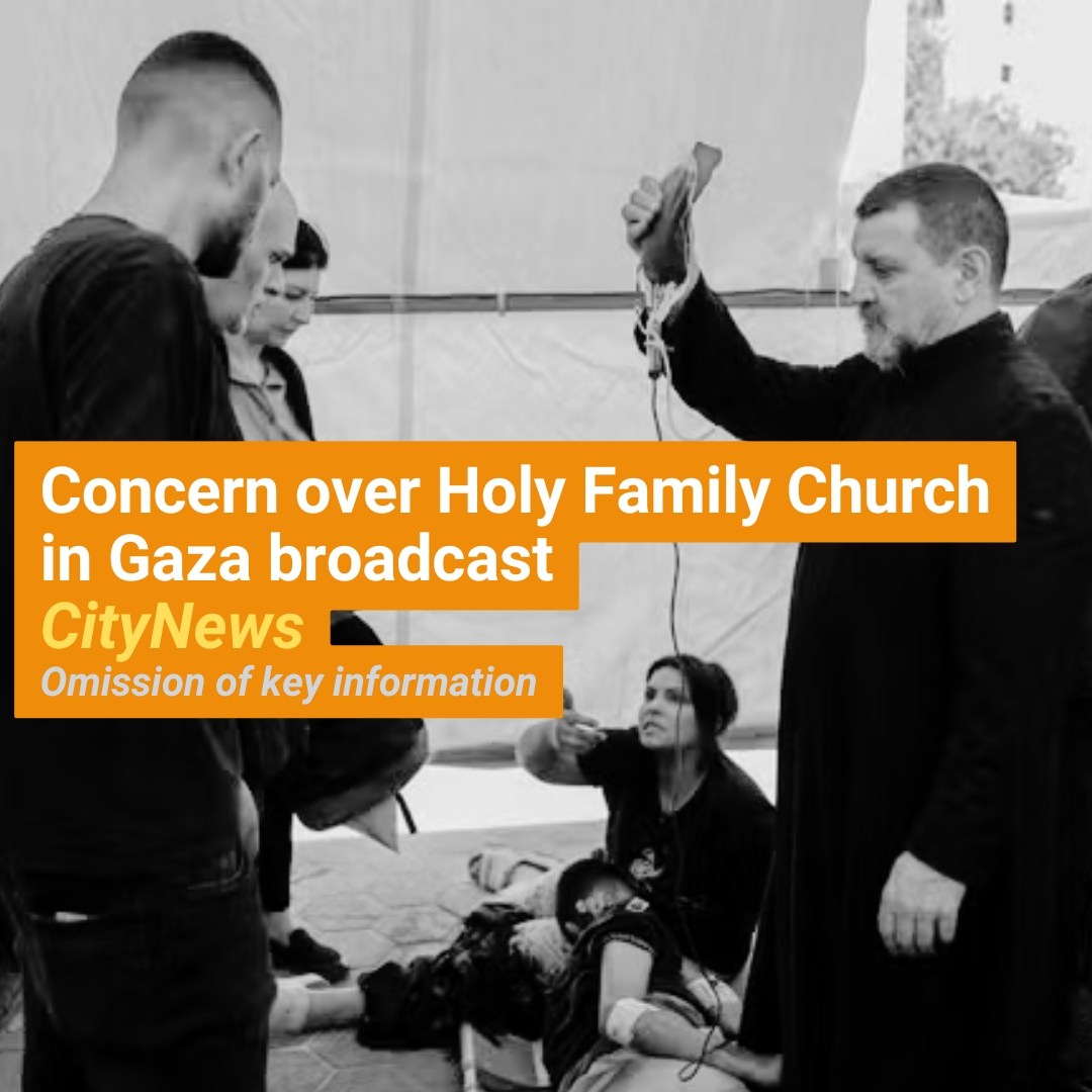 I am writing on behalf of Canadians for Justice and Peace in the Middle East (CJPME) to express my concern regarding your July 18, 2025 broadcast that aired at 6:20 a.m. on CityNews Tonight Calgary which reported on an Israeli airstrike that struck the Holy Family Church in Gaza, the only Catholic church in the enclave, killing at least two civilians and injuring others.