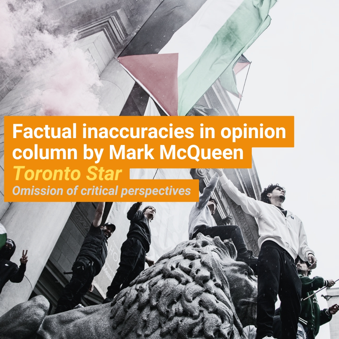 I am writing on behalf of Canadians for Justice and Peace in the Middle East (CJPME) to express my concerns regarding serious factual errors and misleading representations in the June 11, 2025 opinion piece by Mark McQueen, titled “Will protests over Israel-Hamas get ugly in Toronto? Only if police refuse to act.”