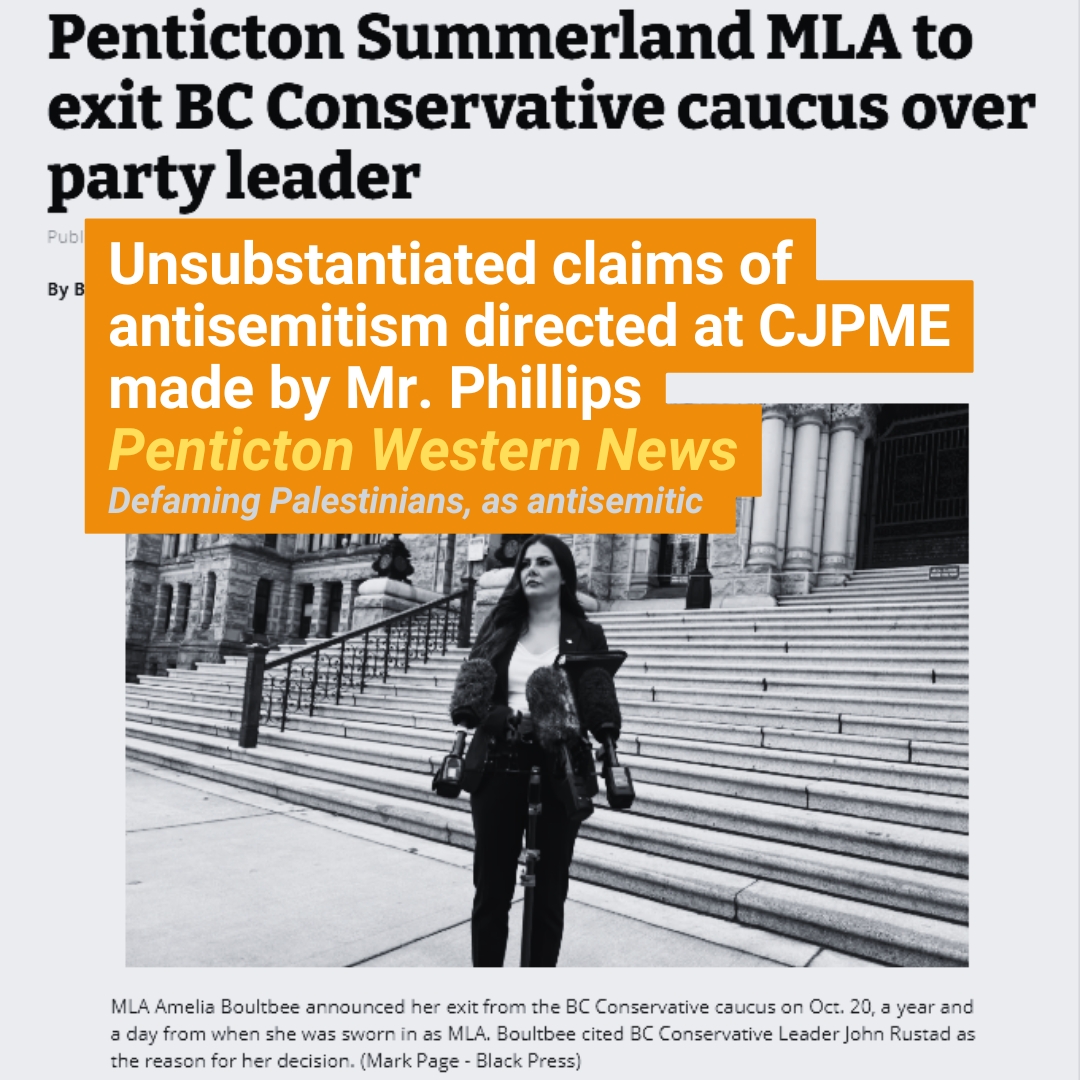 I am writing on behalf of Canadians for Justice and Peace in the Middle East (CJPME) to express my concern regarding your recent article titled “Penticton Summerland MLA to exit BC Conservative caucus over party leader,” published on Oct. 20, 2025.