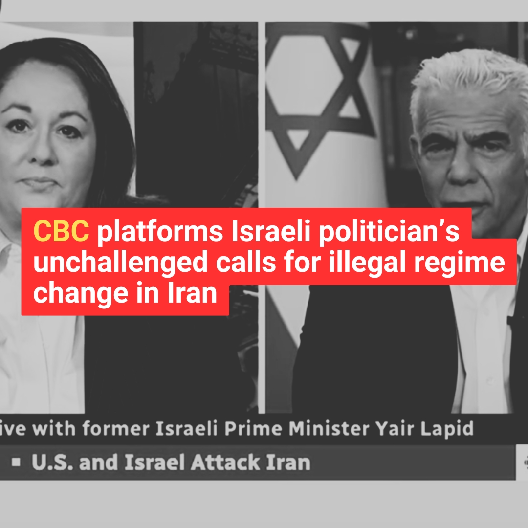 On March 1, 2026, CBC aired a news broadcast on the U.S.-Israeli strikes on Iran. During the segment, host Rosemary Barton allowed Israeli politician Yair Lapid to advocate for regime change in Iran without meaningful journalistic challenge. We ask that media responders demand accountability. Here are some optional angles: