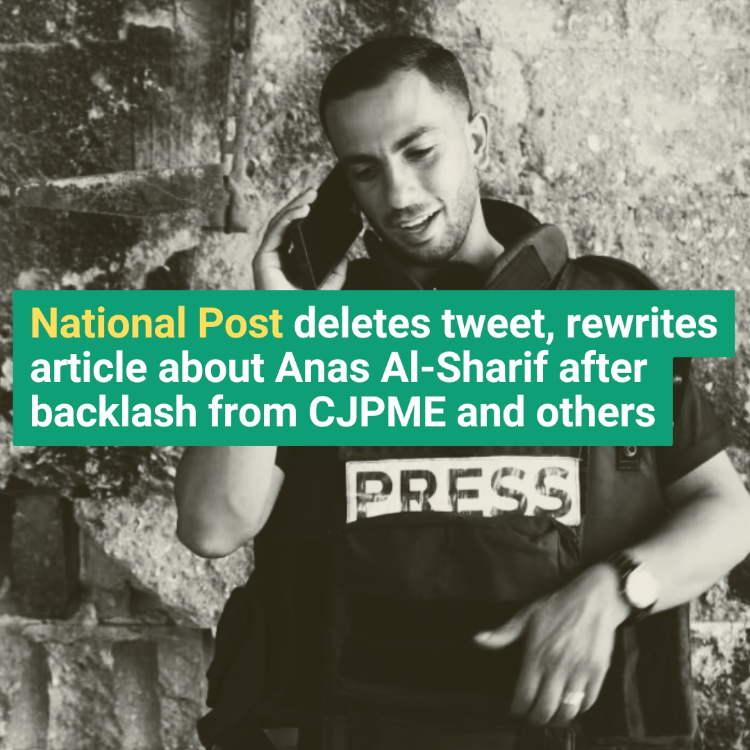 CJPME’s public criticism of the article was widely viewed and shared. In response to the backlash, Postmedia updated the headline to: “Israeli strike in Gaza slays Anas al-Sharif, who Israel says posed as an ‘Al Jazeera’ journalist while directing rocket attacks for Hamas.” While marginally less inflammatory, the headline and article remain deeply troubling. National Post also deleted its tweet about the article following significant push-back.