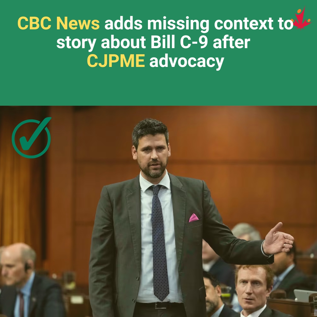 CJPME’s advocacy led to new context and an editor’s note being added to an article by CBC News about the controversial “anti-hate” legislation, Bill C-9.