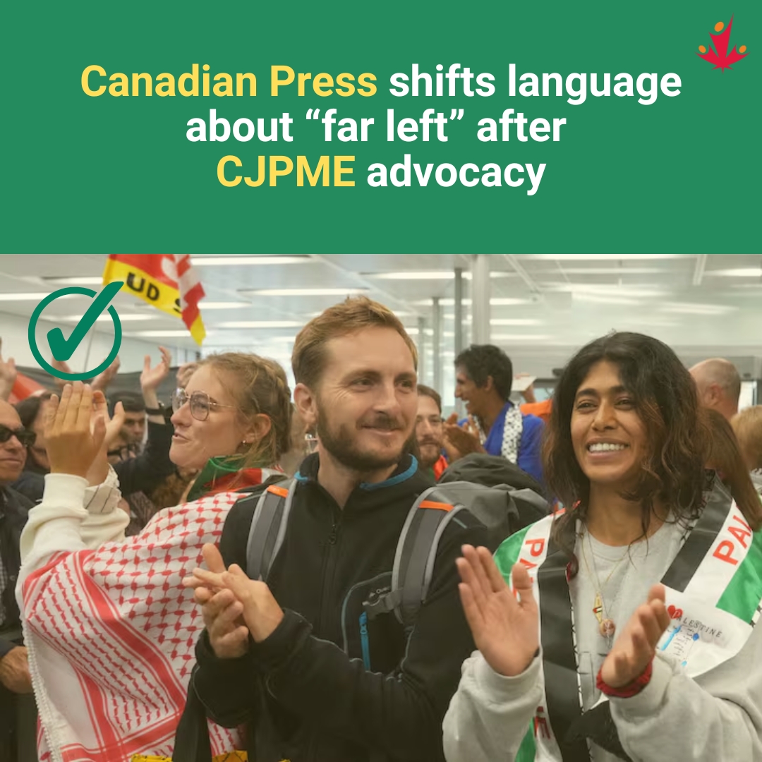 In a Canadian Press article titled, “Pro-Palestine European Parliament member Rima Hassan says she was denied entry to Canada,” European Parliament member Rima Hassan was said to belong to a “far-left” party in France. The description of her party as “far left” is a point of considerable contention, and CJPME raised concerns about how many view this descriptor as a smear to make a prominent Palestine advocate seem fringe.