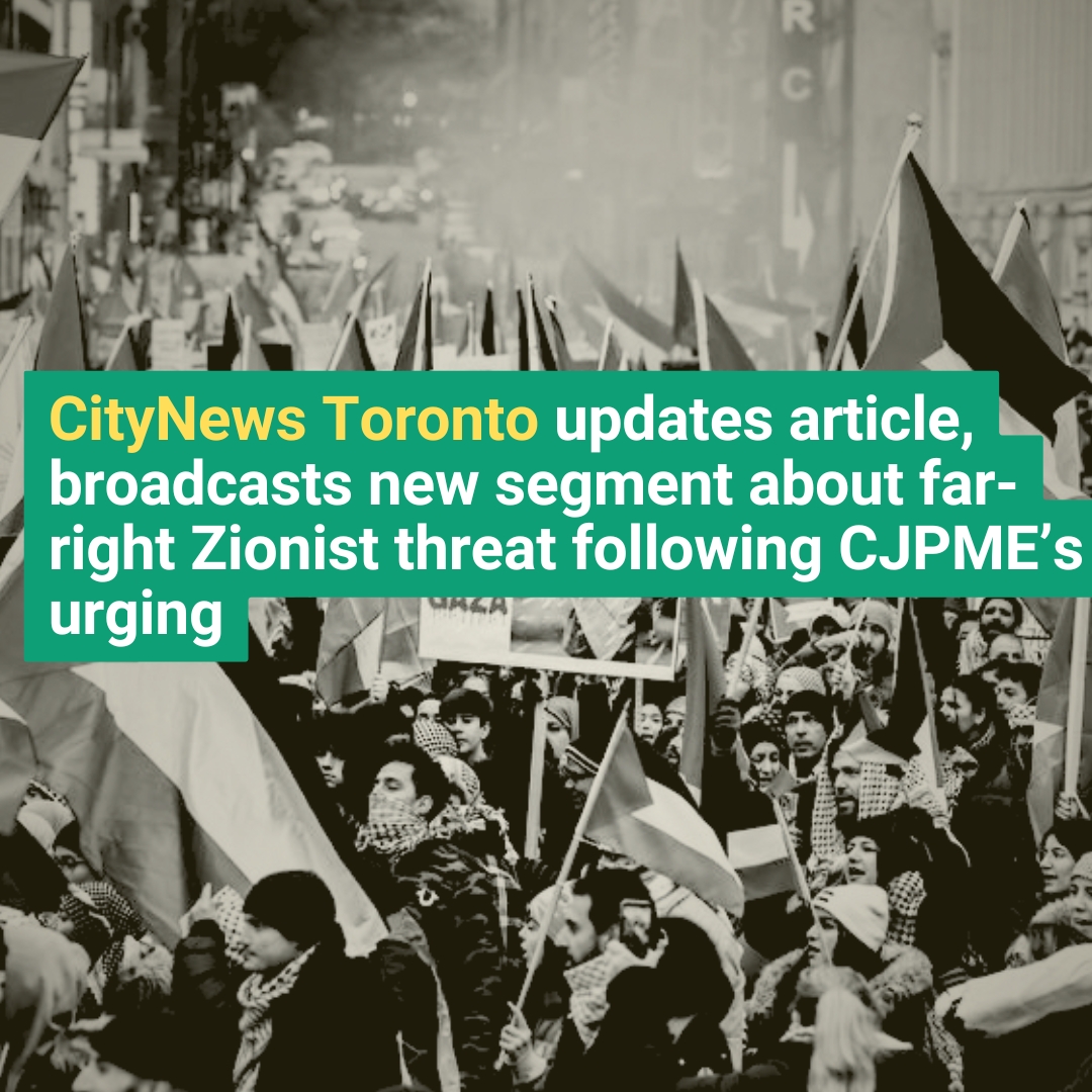 The only outlet to cover the story was CityNews Toronto, which reported the incident using a bare-bones police account and omitted the political context. CJPME filed a complaint with the journalist and editors. Following this, CityNews updated the article and headline to include key information, and they also aired a broadcast segment about the incident. CJPME appreciates CityNews for taking corrective action and drawing attention to this alarming event.