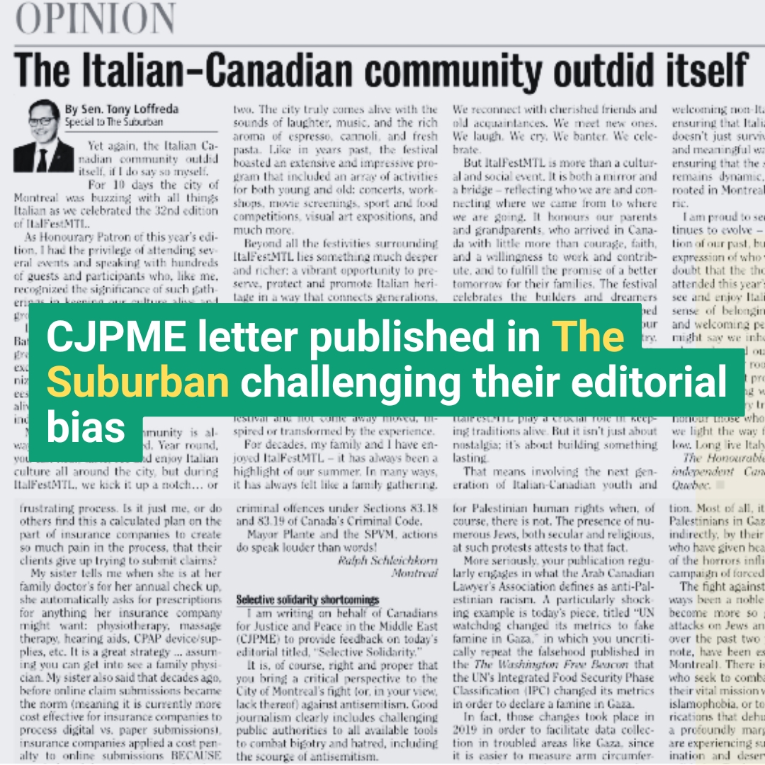 On September 17, 2025, The Suburban published a letter-to-the-editor from CJPME responding to Editor-in-Chief Beryl Wajsman’s September 10 editorial, “Selective Solidarity.”